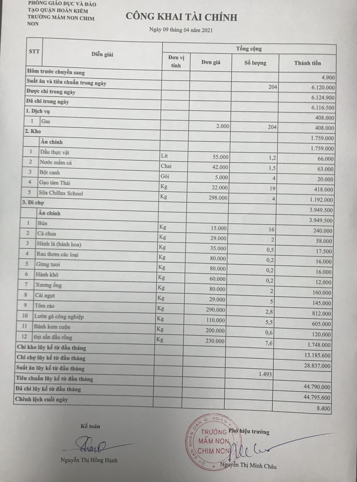 2022-01-08 | 13:50:11 A- A A+ Công khai tài chính ngày 09/4/2021 Chia sẻ Tin bài: Trường Mầm non Chim Non Tin liên quan Công khai tài chính ngày 29/4/2021 Công khai tài chính ngày 28/4/2021 Công khai tài chính ngày 27/4/2021 Công khai tài chính ngày 26/4/2021 Báo cáo về việc ký hợp đồng với các đơn vị cung ứng thực phẩm, lương thực, chất đốt. Năm học 2020 - 2021 Công khai tài chính ngày 23/4/2021 Công khai tài chính ngày 22/4/2021 Công khai tài chính ngày 20/4/2021 Công khai tài chính ngày 19/4/2021 Công khai tài chính ngày 16/4/2021