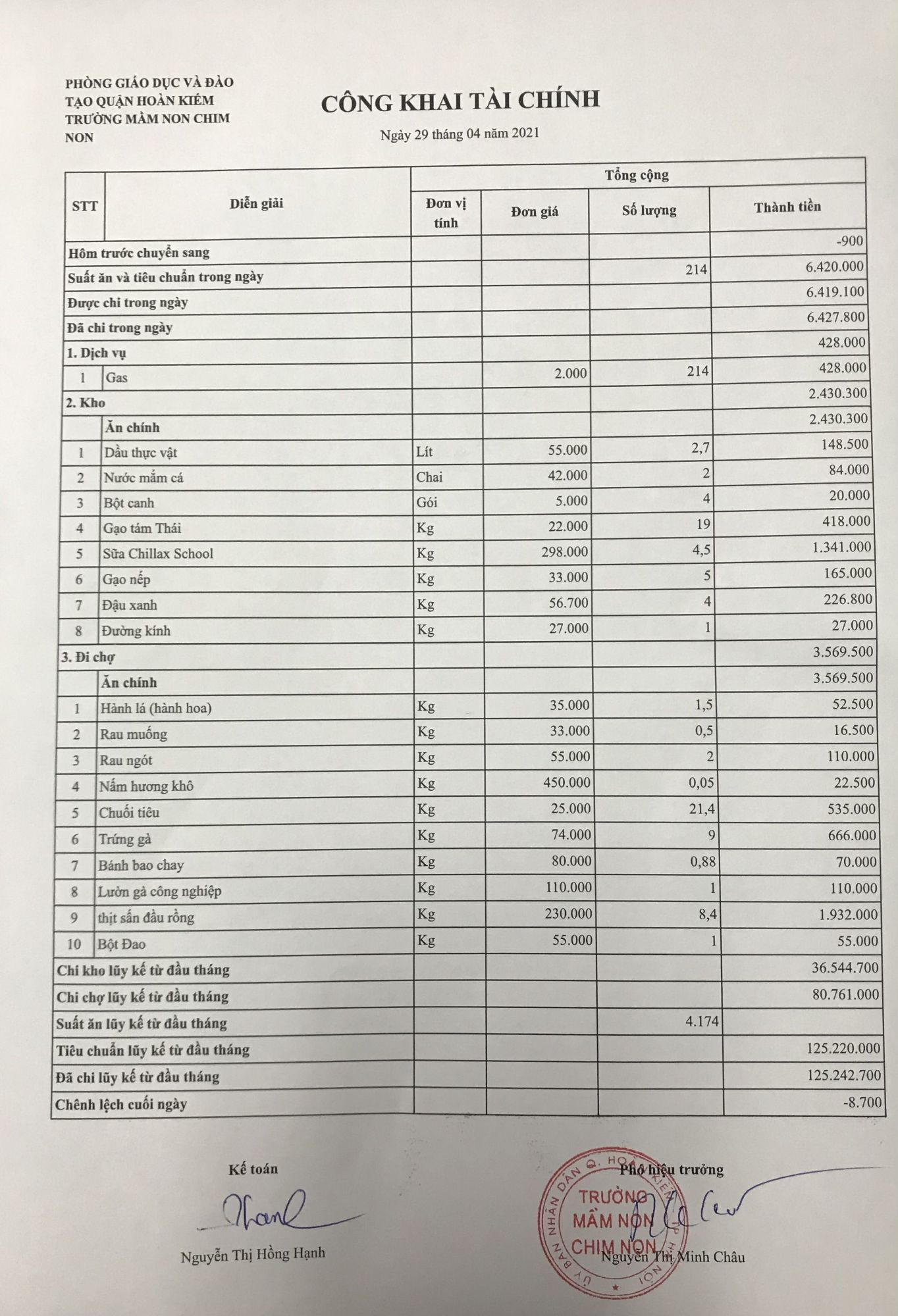 2022-01-08 | 13:50:23 A- A A+ Công khai tài chính ngày 29/4/2021 Chia sẻ Tin bài: Trường Mầm non Chim Non Tin liên quan Công khai tài chính ngày 28/4/2021 Công khai tài chính ngày 27/4/2021 Công khai tài chính ngày 26/4/2021 Báo cáo về việc ký hợp đồng với các đơn vị cung ứng thực phẩm, lương thực, chất đốt. Năm học 2020 - 2021 Công khai tài chính ngày 23/4/2021 Công khai tài chính ngày 22/4/2021 Công khai tài chính ngày 20/4/2021 Công khai tài chính ngày 19/4/2021 Công khai tài chính ngày 16/4/2021 Công khai tài chính ngày 15/4/2021