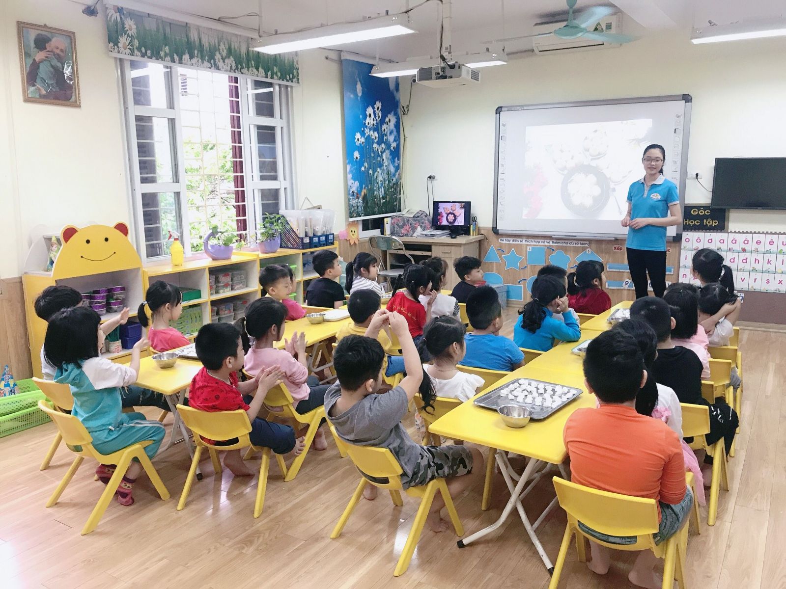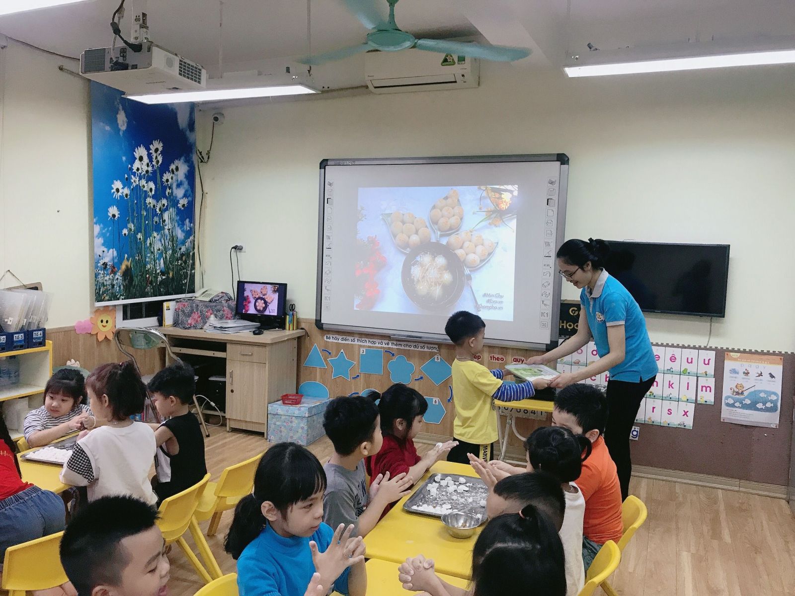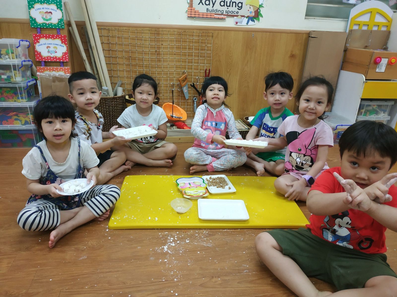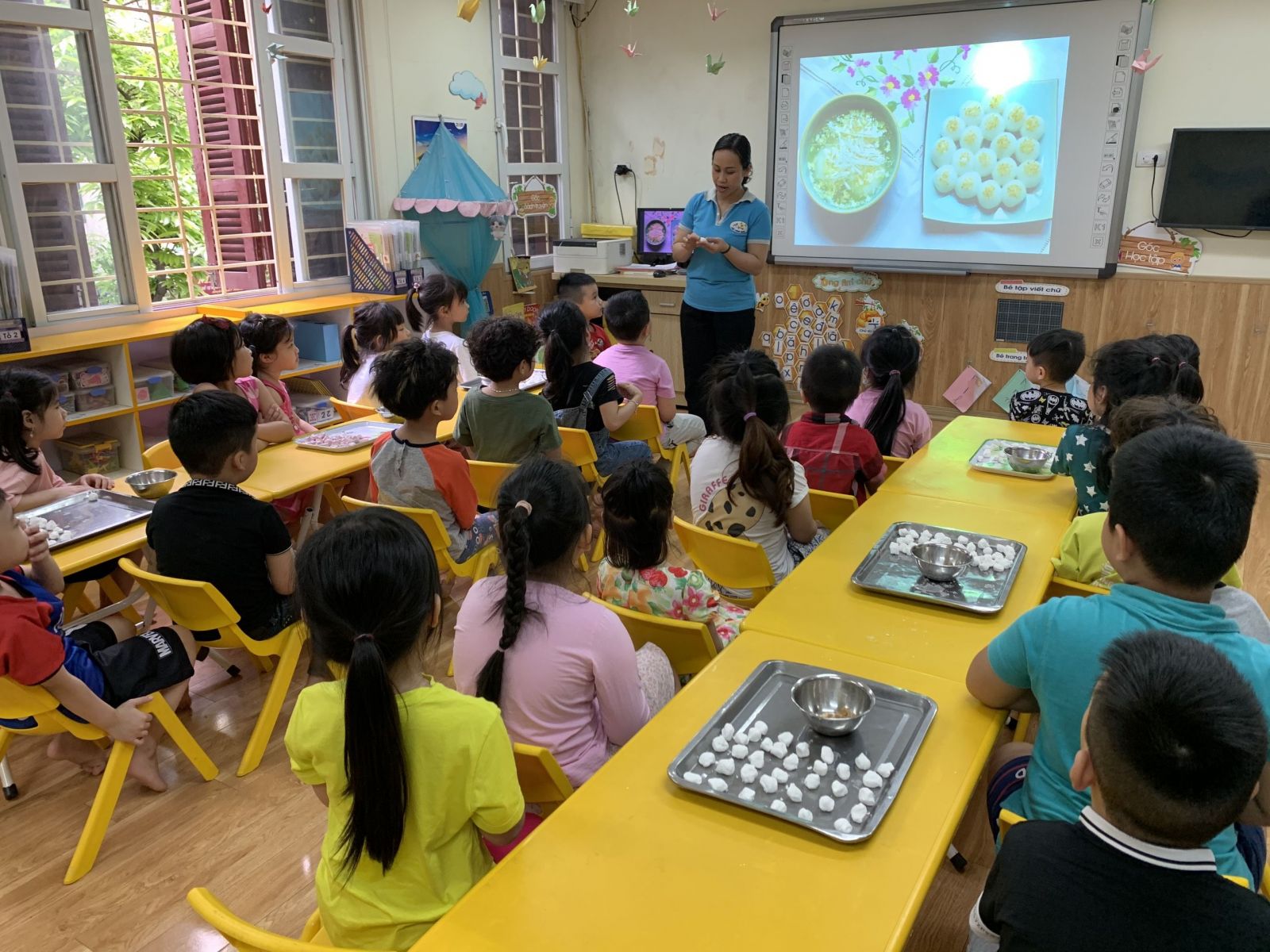 Các em bé nhất trường và các bé mẫu giáo bé làm bánh dưới sự hướng dẫn của cô giáo