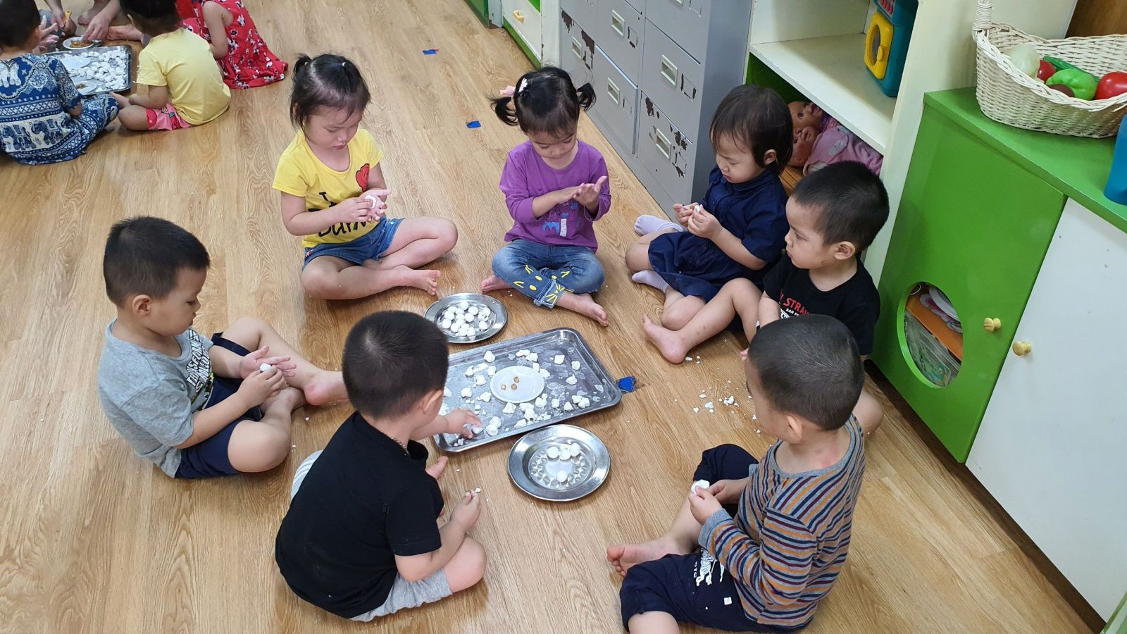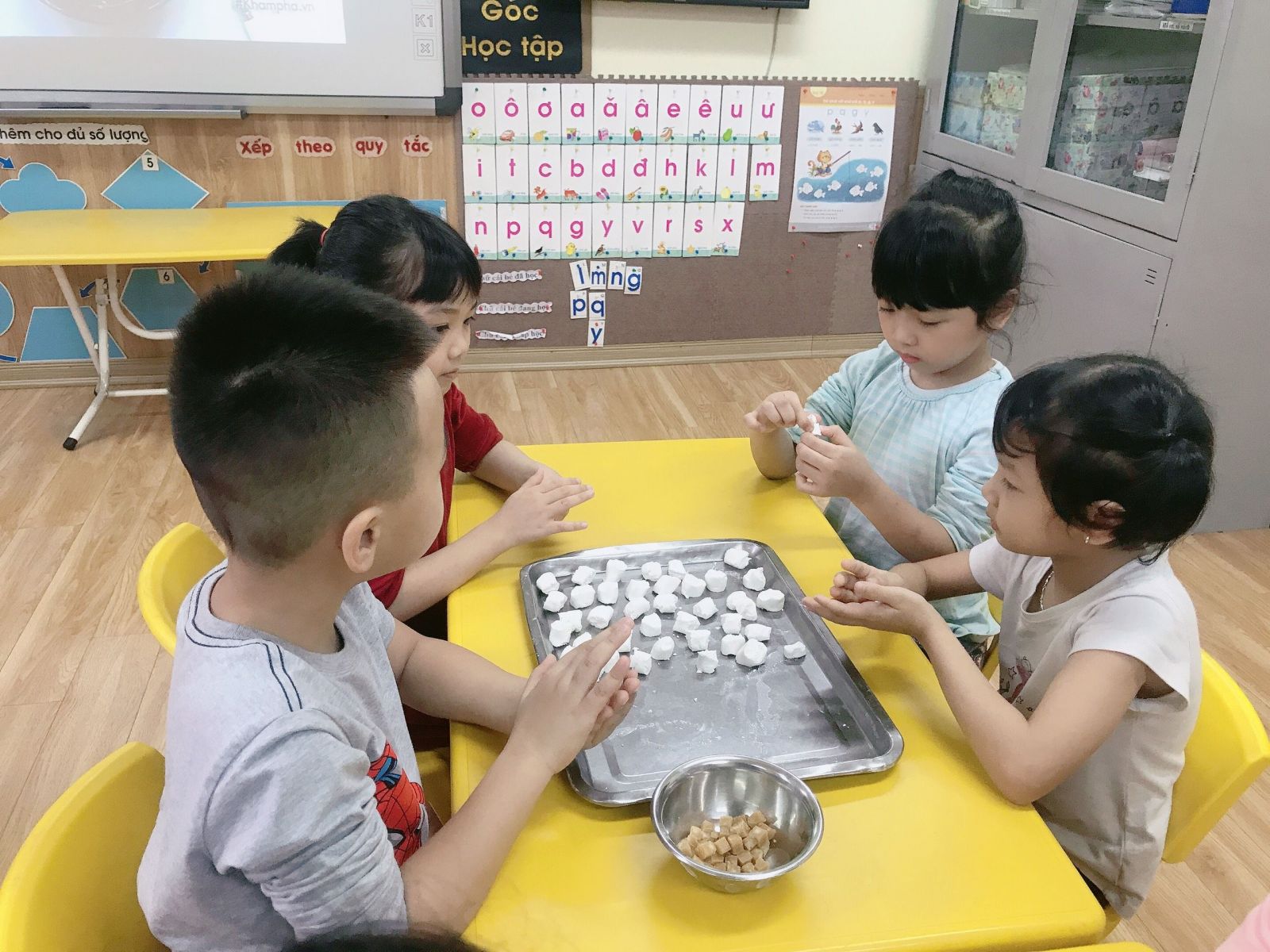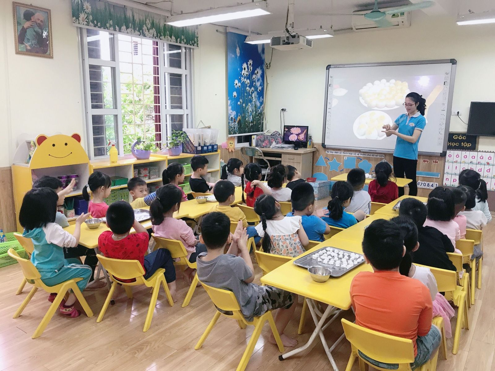 Các em bé nhất trường và các bé mẫu giáo bé làm bánh dưới sự hướng dẫn của cô giáo