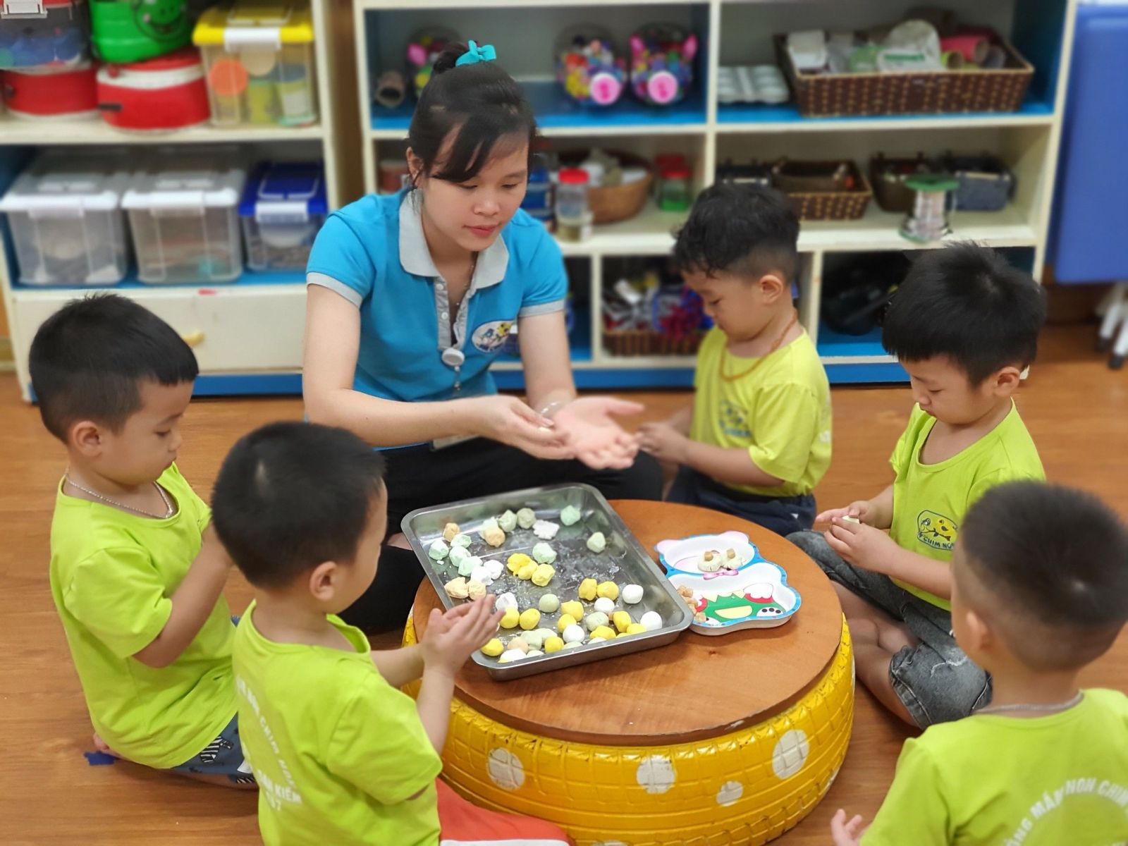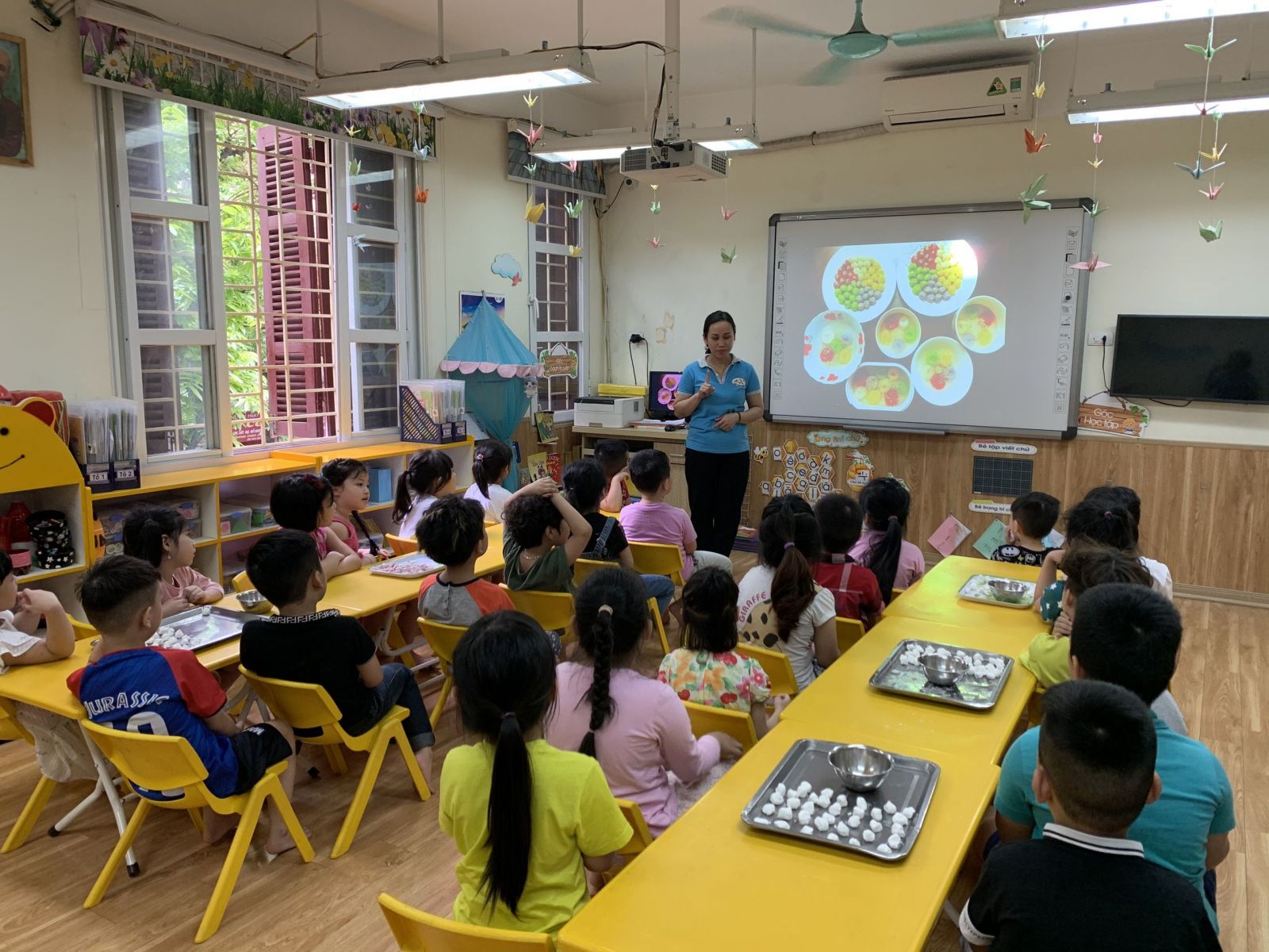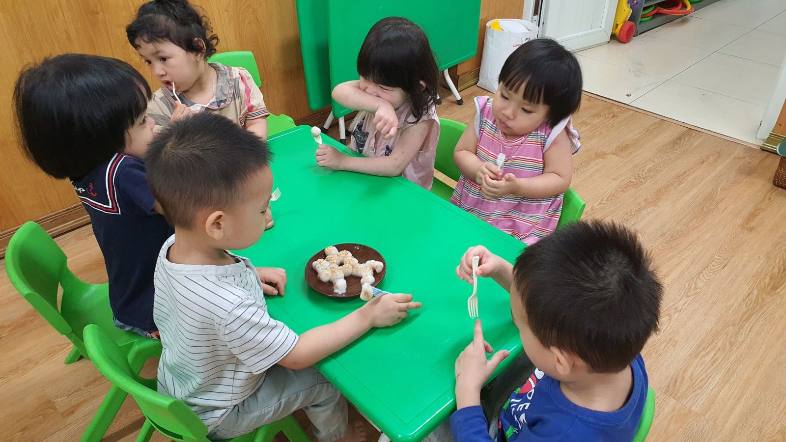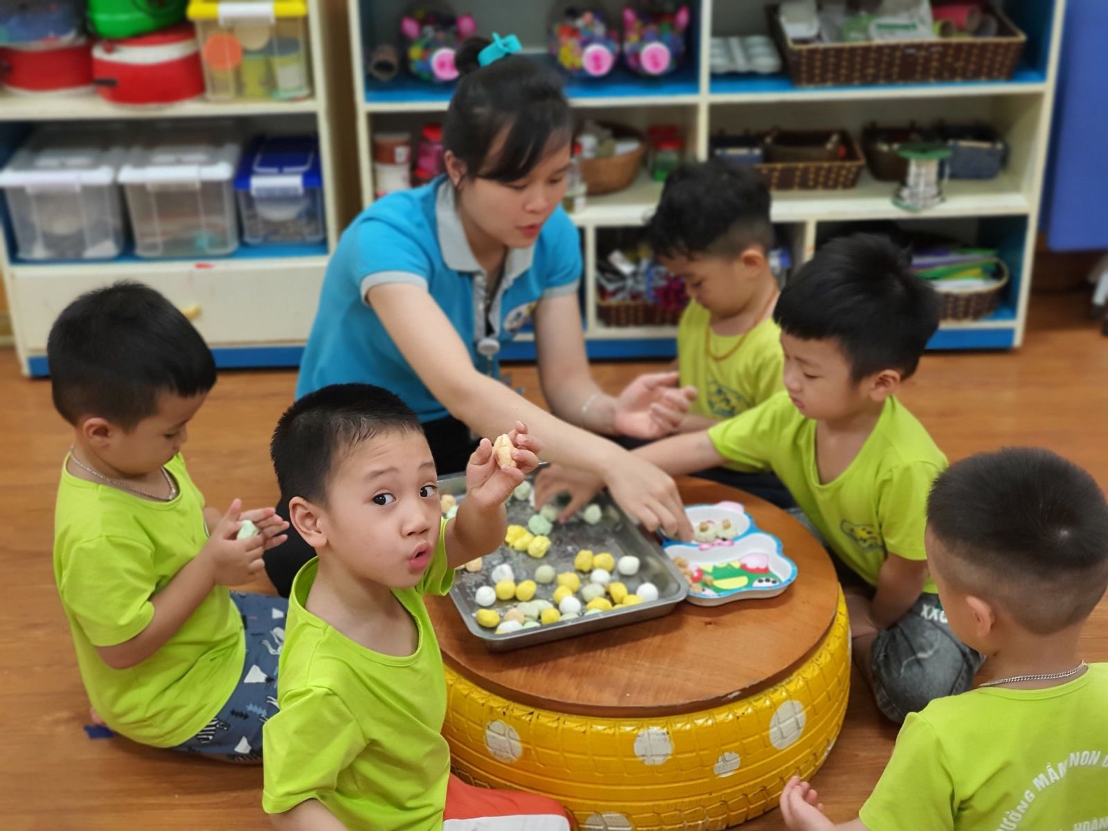 Các em bé nhất trường và các bé mẫu giáo bé làm bánh dưới sự hướng dẫn của cô giáo