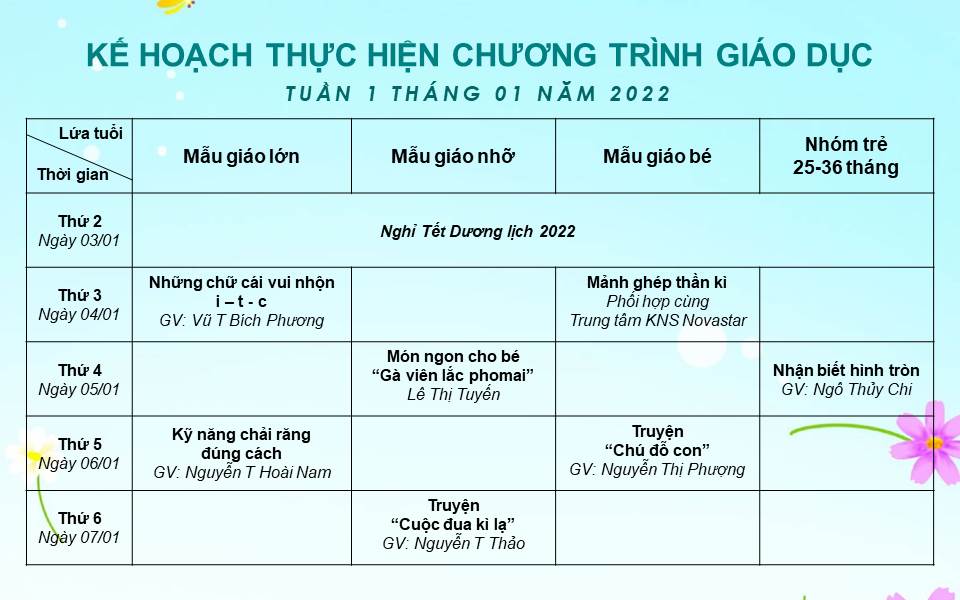 2022-01-08 | 13:44:12 A- A A+ Kế hoạch thực hiện chương trình giáo dục - tuần 1 tháng 01 năm 2022 Chia sẻ Tin liên quan Truyện Đường đua kì lạ - Trường Mầm non Chim Non Truyện “Chú đỗ con” - Trường Mầm non Chim Non Những chữ cái vui nhộn i - t - c - Trường Mầm non Chim Non Nhận biết hình tròn - Trường Mầm non Chim Non Hướng dẫn bé Xé dán đàn cá - Trường Mầm non Chim Non Truyện Dê con nhanh trí - Trường Mầm non Chim Non Dạy trẻ kỹ năng tách hạt ngô - Trường Mầm non Chim Non Bé vui học toán “Số 5” - Trường Mầm non Chim Non Kế hoạch thực hiện chương trình giáo dục - tuần 5 tháng 12 năm 2021 Bé vui học toán Nhận biết, phân biệt khối vuông, khối chữ nhật - Trường Mầm non Chim Non