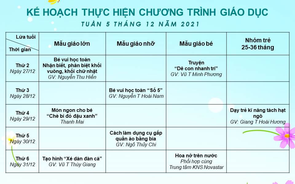 2022-01-08 | 13:44:09 A- A A+ Kế hoạch thực hiện chương trình giáo dục - tuần 5 tháng 12 năm 2021 Chia sẻ Tin liên quan Truyện Đường đua kì lạ - Trường Mầm non Chim Non Truyện “Chú đỗ con” - Trường Mầm non Chim Non Những chữ cái vui nhộn i - t - c - Trường Mầm non Chim Non Nhận biết hình tròn - Trường Mầm non Chim Non Kế hoạch thực hiện chương trình giáo dục - tuần 1 tháng 01 năm 2022 Hướng dẫn bé Xé dán đàn cá - Trường Mầm non Chim Non Truyện Dê con nhanh trí - Trường Mầm non Chim Non Dạy trẻ kỹ năng tách hạt ngô - Trường Mầm non Chim Non Bé vui học toán “Số 5” - Trường Mầm non Chim Non Bé vui học toán Nhận biết, phân biệt khối vuông, khối chữ nhật - Trường Mầm non Chim Non