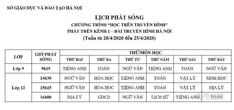 Lịch phát sóng chương trình Học trên truyền hình - (Tuần từ 20/04/2020 đến 25/4/2020)